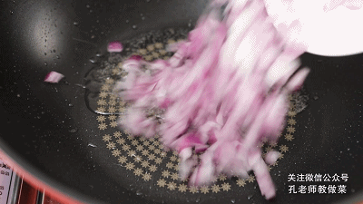6.鍋中留適量煸炒五花肉的底油,下入洋蔥丁、八角、香葉,一起炒香。