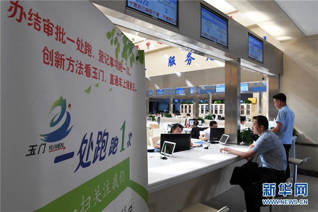 在甘肅省玉門市民中心服務(wù)大廳,市民在窗口辦理業(yè)務(wù)(2018年8月17日攝)。新華社記者 范培珅 攝