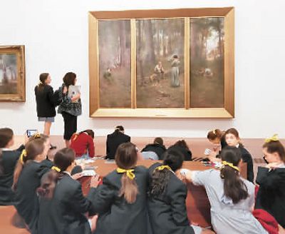 在墨爾本當?shù)氐拿佬g館,孩子們圍坐在一起,聽老師講解畫作。