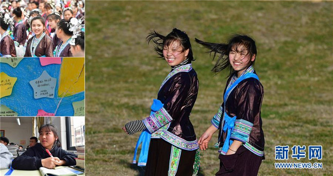 這是一張拼版照片:右圖為韋迎春(右)和同學(xué)在一起(2月6日攝);左上圖為韋迎春(中)在家鄉(xiāng)的“打同年”活動(dòng)中(2月7日攝);左中圖為韋迎春在小卡紙上寫下的夢(mèng)想(3月22日攝);左下圖為韋迎春在課堂上聽課(3月22日攝)。韋迎春來自融水苗族自治縣桿洞鄉(xiāng)堯告村,目前在融水民族高中讀高一。 新華社記者 黃孝邦 攝