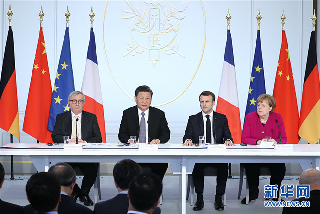 3月26日,國家主席習近平在巴黎同法國總統(tǒng)馬克龍一道出席中法全球治理論壇閉幕式。德國總理默克爾、歐盟委員會主席容克應邀出席。 新華社記者 鞠鵬 攝