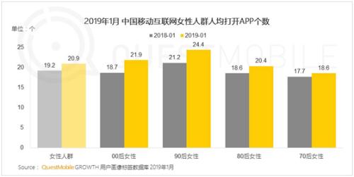 移動大數(shù)據(jù)平臺QuestMobile發(fā)布最新“她經(jīng)濟(jì)”洞察報(bào)告顯示,截至2019年1月,女性用戶人均打開APP個(gè)數(shù)達(dá)21個(gè),高于移動互聯(lián)網(wǎng)的平均水平,主要為短視頻、綜合電商、社交等三類。