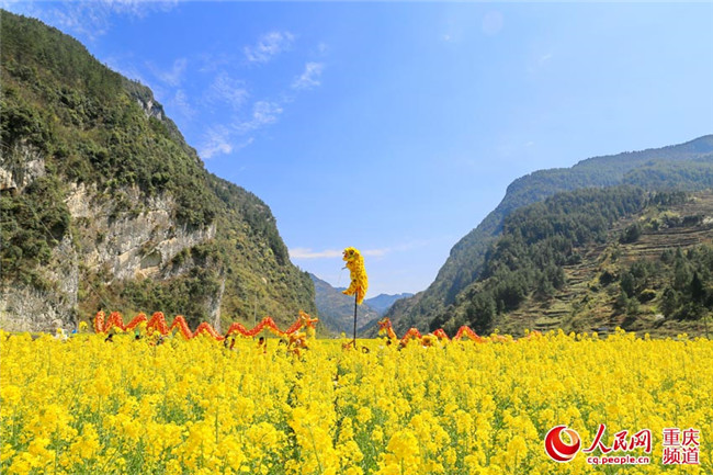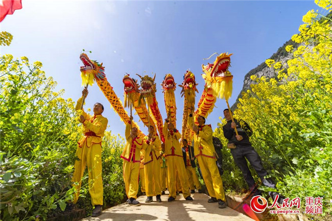 25日,重慶豐都縣暨龍鎮(zhèn)烏羊壩1000畝油菜花盛開,非遺表演“高桿舞獅”為游客助興。(王嫚 林登周)