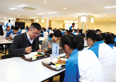 “我可以坐在這兒嗎?”3月25日中午,海淀區(qū)教師進修學(xué)校附屬實驗學(xué)校校長董紅軍在學(xué)生窗口打完飯后,找了一個位置坐下。記者了解到,今年2月份,學(xué)校開始實行副校級干部的輪流陪餐制度,董紅軍是當(dāng)日輪崗的干部。