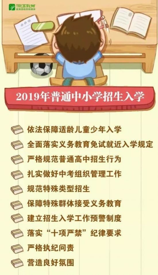 教育部辦公廳印發(fā)《關于做好2019年普通中小學招生入學工作的通知》。《通知》提出依法保障適齡兒童少年入學、全面落實義務教育免試就近入學規(guī)定、嚴格規(guī)范普通高中招生行為、建立招生入學工作預警制度、嚴格執(zhí)紀問責等要求。