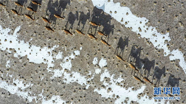 阿爾金山國家級自然保護區(qū)內(nèi)的藏野驢(4月2日無人機拍攝)。 新華社記者 胡虎虎 攝