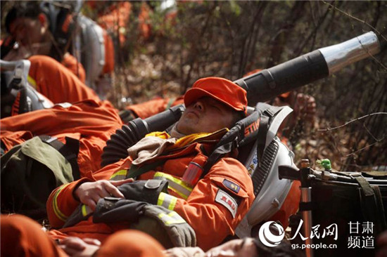火場火勢緩解后,消防員原地休息。(甘肅省森林消防總隊供圖)