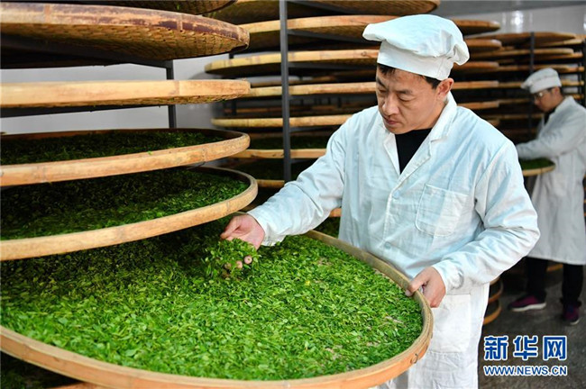 4月10日,平定縣冠山鎮(zhèn)后溝村的村民在檢查連翹葉晾曬情況。