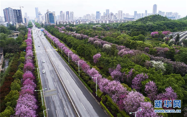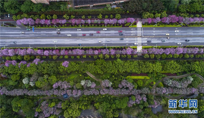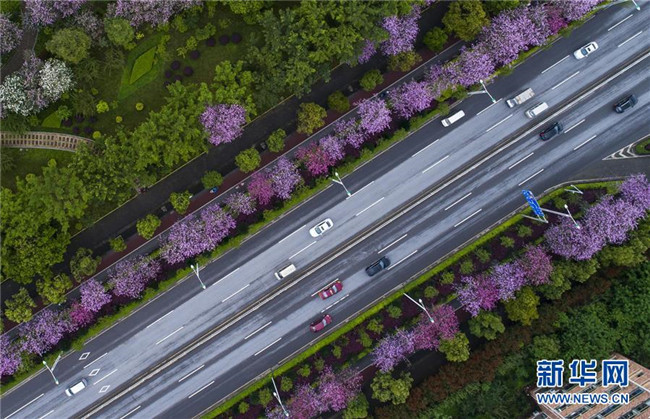 4月14日,在廣西柳州市彎塘路,車輛在開滿洋紫荊的街道上行駛(無人機拍攝)。