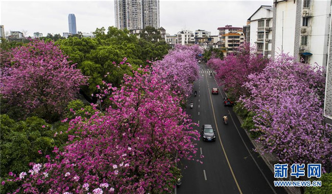當日,一場大雨過后,廣西柳州市內(nèi)的洋紫荊開得格外嬌艷。時下,柳州市區(qū)27萬株洋紫荊進入盛花期。 新華社記者 黃孝邦 攝