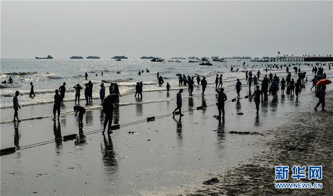 4月18日,游客在北海銀灘游玩。