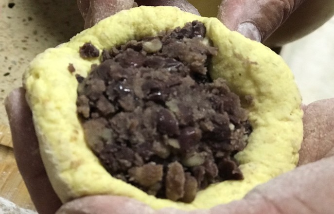 6.制作三合面:三種面粉加酵母混合均勻,然后一點(diǎn)點(diǎn)加溫水和成軟硬適中的面團(tuán),在溫暖處發(fā)酵至兩倍大。