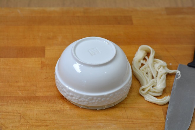 8.將幾張搟好的餅皮摞一起,取一個(gè)碗,碗口扣在餅上,用刀丸沿著碗邊將多余的餅劃掉;