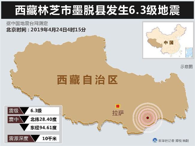 4月24日4時15分,在西藏林芝市墨脫縣(北緯28.40度,東經(jīng)94.61度)發(fā)生6.3級地震,震源深度10千米。林芝消防力量已趕赴震中應(yīng)急處置,向當(dāng)?shù)亓私獾那闆r顯示,中心區(qū)域震感強(qiáng)烈。(記者葉昊鳴)