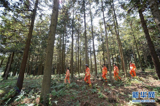 4月27日,在貴州省畢節(jié)市赫章縣平山國有林場,李瓊江(右一)、李?。ㄓ胰┖土謭雎毠ぴ谧o林途中。 新華社記者 楊楹 攝