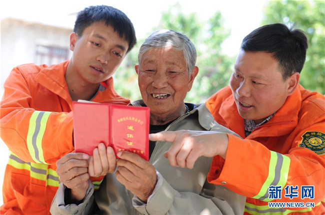 4月27日,在貴州省畢節(jié)市赫章縣平山國有林場,李代關(guān)老人(中)向兒子李瓊江(右)、孫子李健展示他的退休證。 新華社記者 楊楹 攝