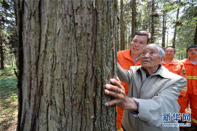 4月27日,在貴州省畢節(jié)市赫章縣平山國有林場,李代關(guān)老人(前)在查看當年和同事種的杉樹。 新華社記者 楊楹 攝