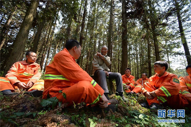 4月27日,在貴州省畢節(jié)市赫章縣平山國有林場,李代關(guān)老人(左三)與林場職工交流。 新華社記者 楊楹 攝