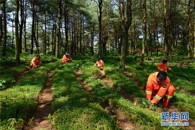 4月27日,平山國有林場職工在查看林下營養(yǎng)袋育苗長勢情況。 新華社發(fā)(尚宇杰 攝)