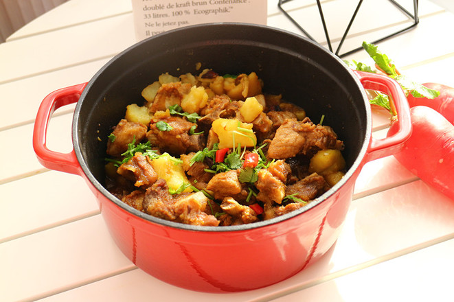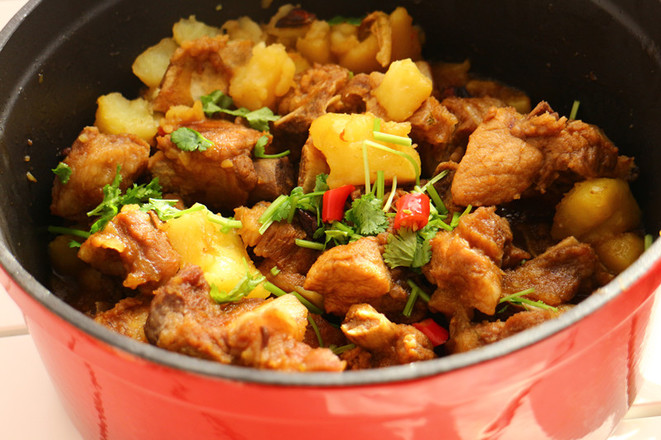10.撒上少許的辣椒,香菜點(diǎn)綴提味,香噴噴的排骨土豆就做好了,雖然是家常菜,但是做出來一樣特別的好吃。