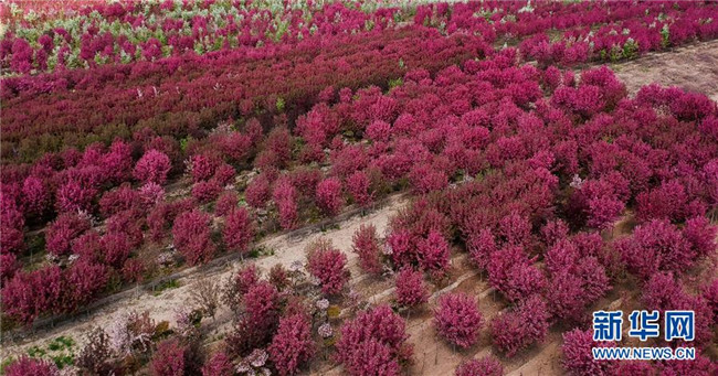 呼圖壁縣二十里店鎮(zhèn)北美海棠園內(nèi)的海棠花競相開放(4月28日無人機拍攝)。