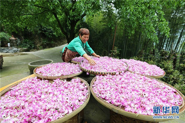 5月4日,在貴州省赤水市白云鄉(xiāng)平灘村,農(nóng)戶在晾曬剛采摘的金釵石斛鮮花。