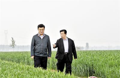 國(guó)務(wù)院發(fā)展研究中心專(zhuān)家、大名縣掛職縣委常委、副縣長(zhǎng)吳平(左)與萬(wàn)北村黨總支書(shū)記董可志探討萬(wàn)北村鄉(xiāng)村振興發(fā)展之路。 記者 耿輝攝