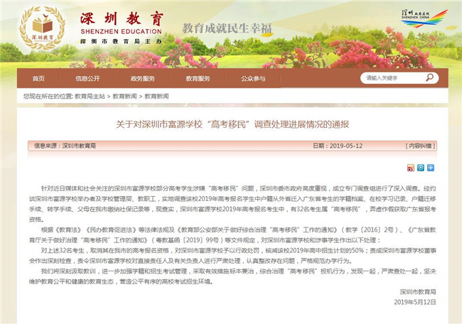 深圳市教育局網(wǎng)站12日發(fā)布《關(guān)于對(duì)深圳市富源學(xué)校“高考移民”調(diào)查處理進(jìn)展情況的通報(bào)》(以下簡稱《通報(bào)》)?!锻▓?bào)》指出:經(jīng)查實(shí),深圳市富源學(xué)校2019年高考報(bào)名考生中,有32名考生屬“高考移民”,弄虛作假獲取廣東省報(bào)考資格。將取消此32名考生在深圳市的高考報(bào)名資格。