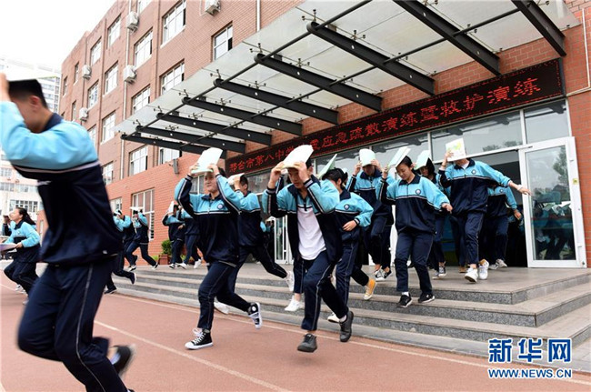 5月12日,邢臺市第八中學(xué)學(xué)生在進行模擬緊急疏散演練。新華社記者 朱旭東 攝