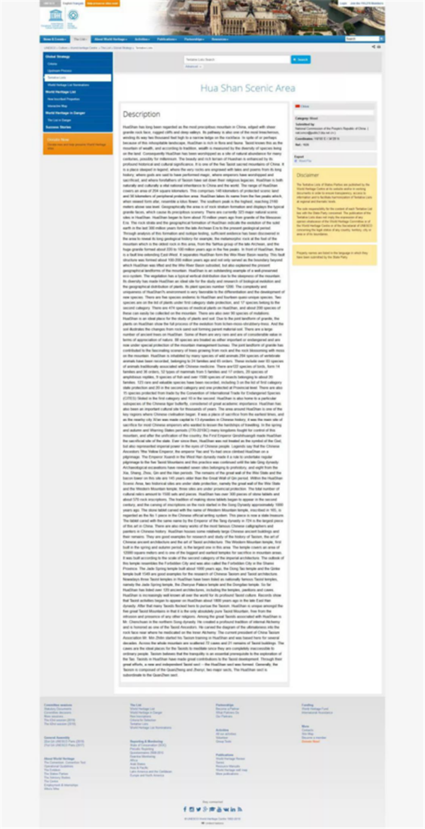 聯合國教科文組織官網華山篇網頁截圖