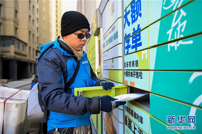 內蒙古呼和浩特中通快遞新華東街分部的快遞員程泓毅向快遞柜中投放包裹(1月23日攝)。新華社記者 彭源 攝
