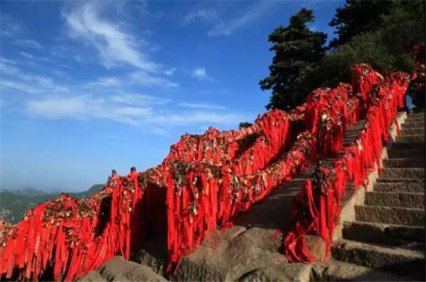 如果走到華山之上的金鎖關(guān)時(shí),就會(huì)發(fā)現(xiàn)一番令人動(dòng)容的風(fēng)景:關(guān)內(nèi)、關(guān)外登山路兩側(cè)的鐵索上,情侶鎖重重疊疊,紅繩彩線迎風(fēng)搖曳,筑成了一道美麗的愛情心愿風(fēng)景線。