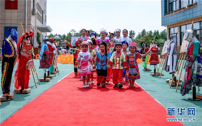5月28日,家長和孩子們在展示不同民族的服飾。