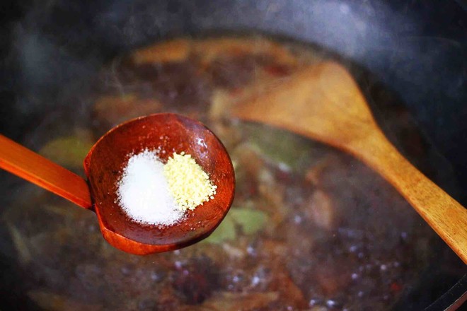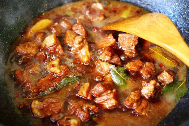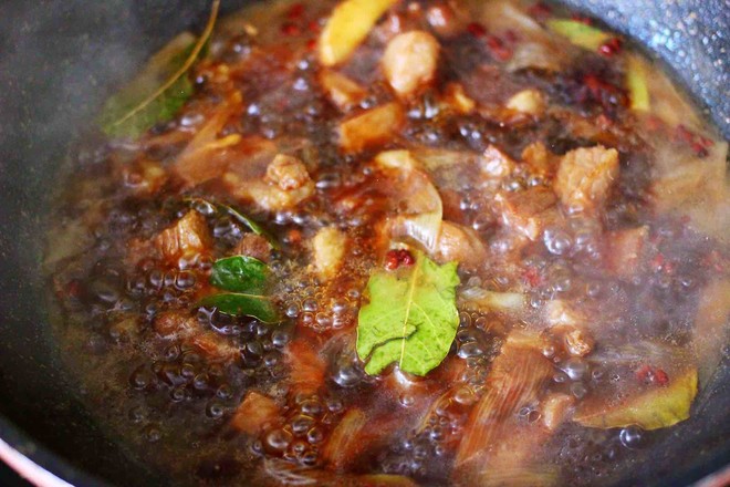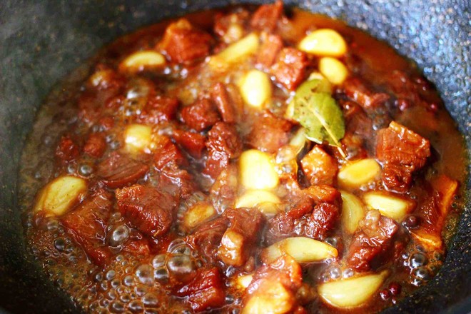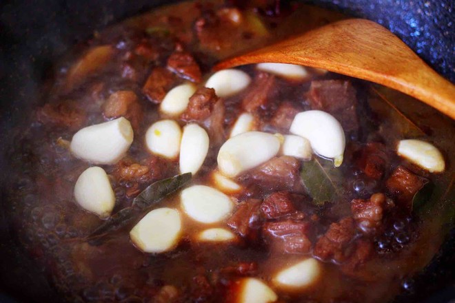 17.小火繼續(xù)燉煮至牛肉和大蒜變得軟糯的時(shí)候。