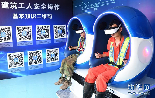 6月5日,重慶化龍橋超高層項(xiàng)目工人在VR安全體驗(yàn)館內(nèi)通過(guò)特種標(biāo)識(shí)識(shí)別系統(tǒng)學(xué)習(xí)安全標(biāo)識(shí)。新華社記者 王全超 攝