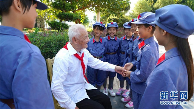 抗戰(zhàn)老兵萬更志(左二)給江西省于都縣長征源小學的學生講述紅色故事(2018年9月29日攝)。新華社記者 胡晨歡 攝