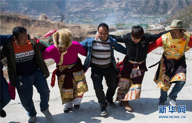 在云南香格里拉市五境鄉(xiāng),“精準(zhǔn)扶貧感恩連”隊(duì)員在跳鍋莊(3月13日攝)。新華社記者 胡超 攝
