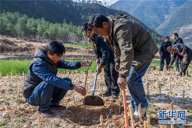 在云南香格里拉市五境鄉(xiāng),格茸(左)和“精準(zhǔn)扶貧感恩連”隊(duì)員在植樹(3月13日攝)。 新華社記者 胡超 攝