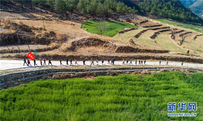 “精準(zhǔn)扶貧感恩連”在云南香格里拉市五境鄉(xiāng)開展植樹活動(dòng)(3月13日無(wú)人機(jī)拍攝)。新華社記者 胡超 攝