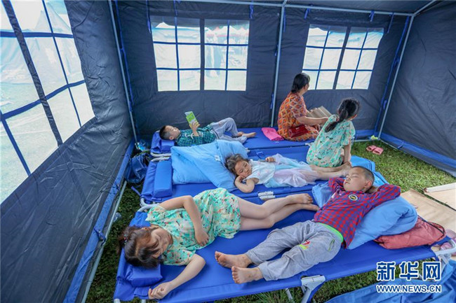 6月18日,在長寧縣雙河鎮(zhèn)雙河中學(xué)安置點(diǎn),受災(zāi)群眾在帳篷里休息。新華社發(fā)(劉昌松攝)