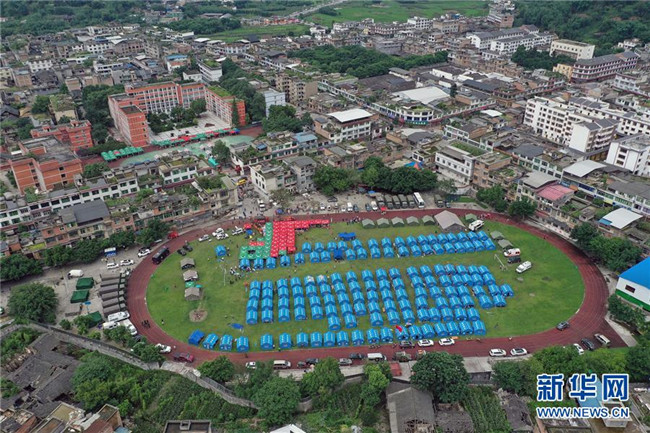 6月18日無人機(jī)拍攝的長(zhǎng)寧縣雙河中學(xué)安置點(diǎn)。 新華社發(fā)(曾朗 攝)