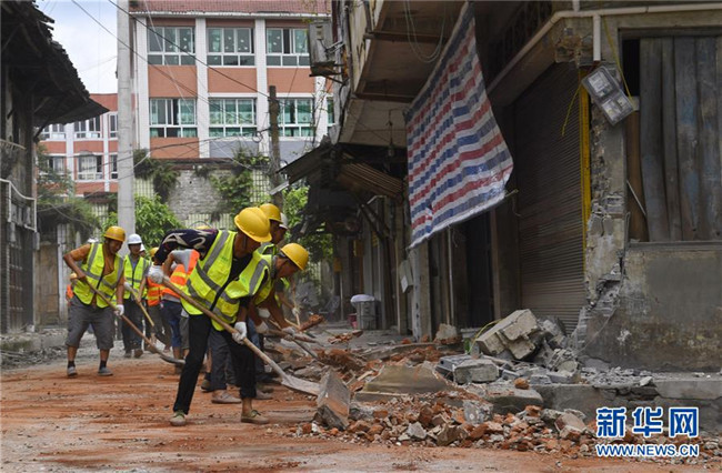 6月18日,工人在清理街道上的碎石。新華社記者 劉坤 攝