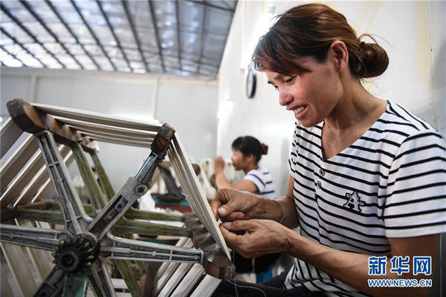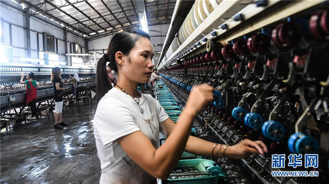 6月18日,在廣西隆林縣輕工業(yè)園區(qū)一家繅絲廠,來自易地扶貧搬遷安置點的群眾在“扶貧車間”紡紗。