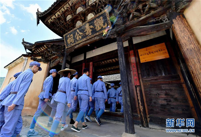 6月17日,在長(zhǎng)汀縣南山鎮(zhèn)中復(fù)村觀壽公祠前,媒體記者在重溫當(dāng)年紅軍長(zhǎng)征前的場(chǎng)景。 新華社記者魏培全攝