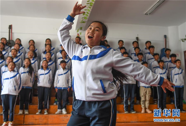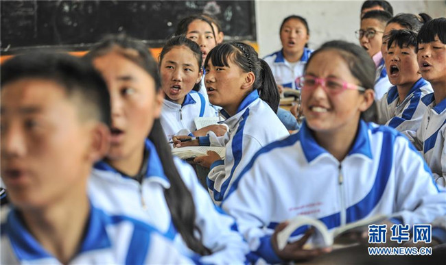 鹽井中學(xué)的學(xué)生們在上英語課(6月6日攝)。年輕的藏族女教師坐在鋼琴前,手指靈動地彈奏樂曲,兩名學(xué)生拉起弦子伴奏,三十多名學(xué)生站成四排,齊聲合唱。學(xué)?;@球場上數(shù)名身材高大的學(xué)生,正在體育老師的組織下進(jìn)行激烈的分組對抗,不一會兒,學(xué)生們個個汗流浹背。綜合樓三樓的化學(xué)實驗室內(nèi),身穿白色大褂的學(xué)生,分成若干小組,正在做簡單的化學(xué)實驗。這一幕幕,同時出現(xiàn)在西藏昌都市芒康縣鹽井中學(xué)。新華社記者晉美多吉攝