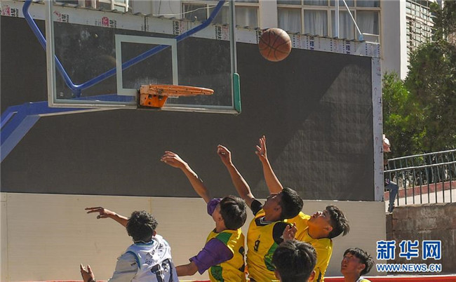 鹽井中學(xué)的學(xué)生們在體育課上打籃球(6月6日攝)。年輕的藏族女教師坐在鋼琴前,手指靈動地彈奏樂曲,兩名學(xué)生拉起弦子伴奏,三十多名學(xué)生站成四排,齊聲合唱。學(xué)校籃球場上數(shù)名身材高大的學(xué)生,正在體育老師的組織下進(jìn)行激烈的分組對抗,不一會兒,學(xué)生們個個汗流浹背。綜合樓三樓的化學(xué)實驗室內(nèi),身穿白色大褂的學(xué)生,分成若干小組,正在做簡單的化學(xué)實驗。這一幕幕,同時出現(xiàn)在西藏昌都市芒康縣鹽井中學(xué)。新華社記者晉美多吉攝