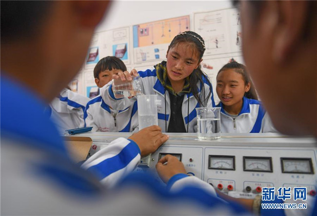 鹽井中學(xué)的學(xué)生們在上物理課(6月6日攝)。年輕的藏族女教師坐在鋼琴前,手指靈動地彈奏樂曲,兩名學(xué)生拉起弦子伴奏,三十多名學(xué)生站成四排,齊聲合唱。學(xué)?;@球場上數(shù)名身材高大的學(xué)生,正在體育老師的組織下進(jìn)行激烈的分組對抗,不一會兒,學(xué)生們個個汗流浹背。綜合樓三樓的化學(xué)實驗室內(nèi),身穿白色大褂的學(xué)生,分成若干小組,正在做簡單的化學(xué)實驗。這一幕幕,同時出現(xiàn)在西藏昌都市芒康縣鹽井中學(xué)。新華社記者晉美多吉攝
