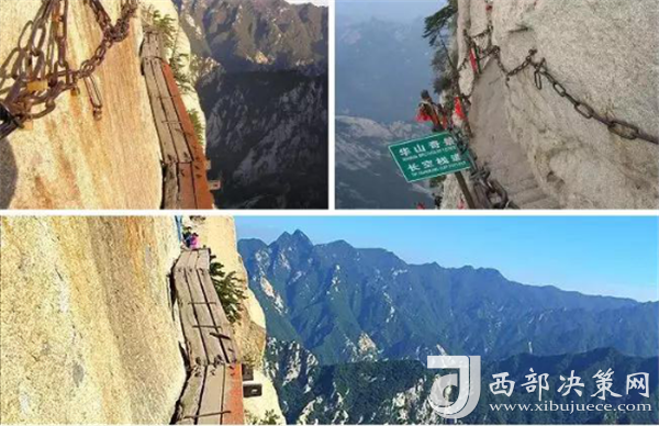 長(zhǎng)空棧道位于華山南峰東側(cè)山腰,是華山派第一代宗師元代高道賀志真為遠(yuǎn)離塵世靜修成仙,在萬仞絕壁上鑲嵌石釘搭木椽而筑。棧道上下皆是懸崖絕壁,鐵索橫懸,由條石搭成尺許路面,下由石柱固定,游人至此,面壁貼腹,屏氣挪步,被譽(yù)為“華山第一天險(xiǎn)”。由于棧道險(xiǎn)峻,故當(dāng)?shù)厝擞?ldquo;小心九厘三分,要尋尸首,洛南商州”之說。這里只是探險(xiǎn)之道,并非登山必由之路,膽小人就在升表臺(tái)看看也就行了。所以石刻上不少警告之語:“懸崖勒馬”等。