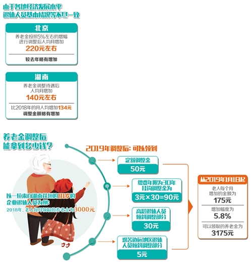比如,北京市人力資源和社會(huì)保障局發(fā)布的調(diào)整方案顯示,養(yǎng)老金按照5%左右的增幅進(jìn)行調(diào)整后,人均增加220元左右,較去年略有增加;湖南省公布的退休人員養(yǎng)老金調(diào)整方案顯示,養(yǎng)老金調(diào)整后,人均月增加金額為140元左右,比2018年的月人均增加134元,調(diào)整金額略有增加;寧夏決定從2019年1月1日起調(diào)整全區(qū)企業(yè)和機(jī)關(guān)事業(yè)單位退休人員基本養(yǎng)老金,其中企業(yè)提高比例為5.5%,機(jī)關(guān)事業(yè)單位提高比例為4%,預(yù)計(jì)全區(qū)共有63.67萬人受益。