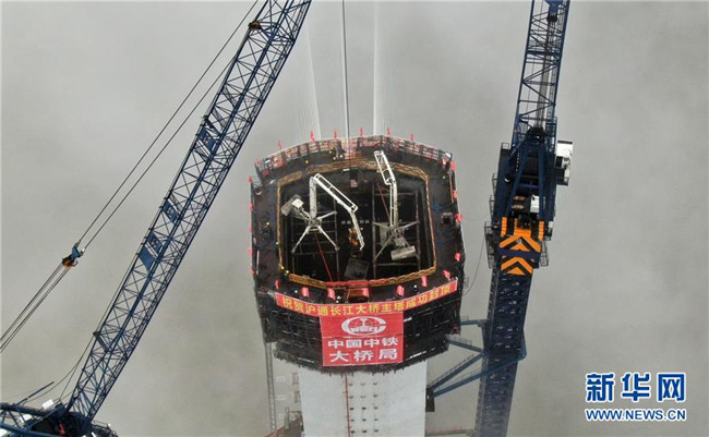 當日,滬通長江大橋南主塔順利封頂。至此,該橋兩座高達330米的主塔全部建成,標志著世界最大跨度公鐵兩用斜拉橋建設(shè)取得了關(guān)鍵性進展。滬通長江大橋全長11072米,主橋長2296米,主跨1092米,是滬通鐵路全線的控制性工程,設(shè)計為上層6車道高速公路,下層4線鐵路。新華社發(fā)(許叢軍攝)